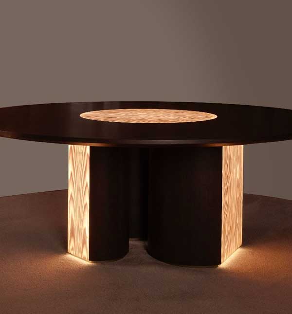 The Teseo round table combines a natural wood top with integrated Brightwood® lighting technology, offering elegance, adjustable lighting, and refined design.